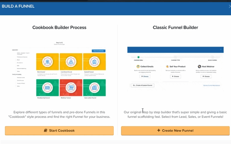 You can pick a classic funnel builder or cookbook builder process which is something that ClickFunnels introduced but didn’t really take off.