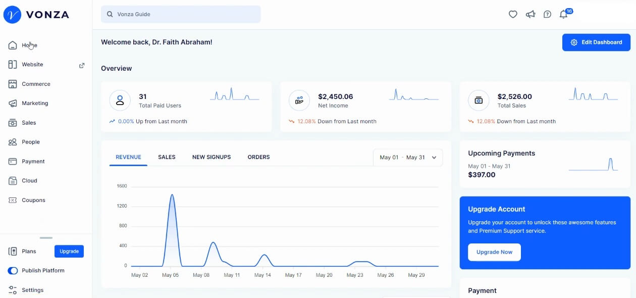 Vonza dashboard provides you with a snapshot of an eye-pleasing view of all sales, paid users, net income, lifetime sales, and even new signups and orders.