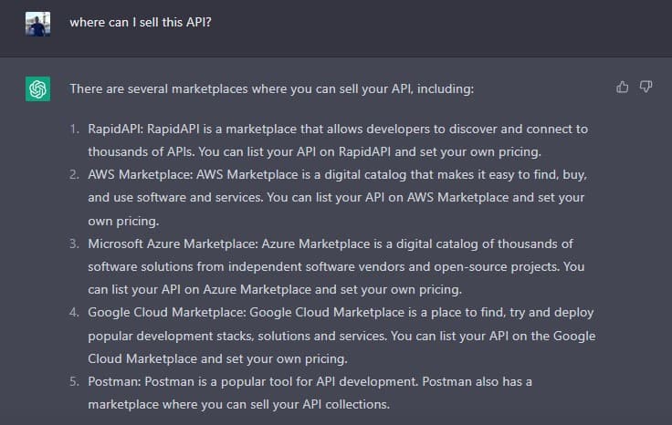 Let’s ask Chat GPT. And here we have a lot of marketplaces where we can publish our API and sell it like Rapid API and much more.