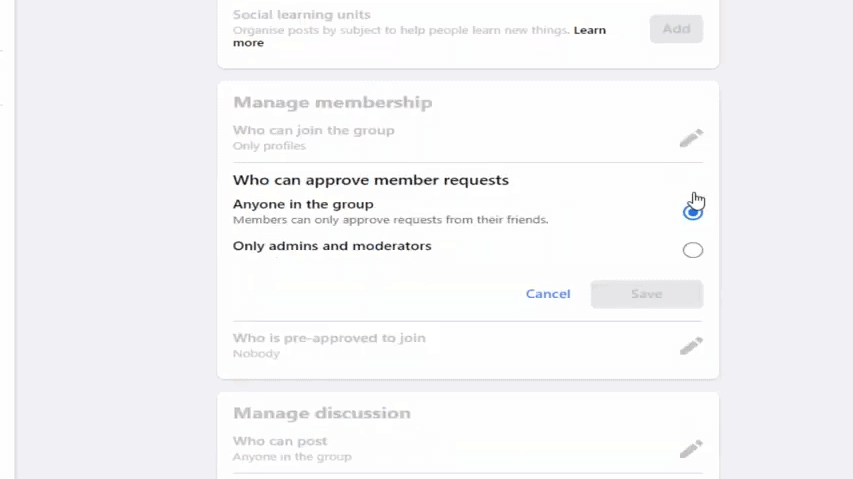 Then “Who can approve member request” which means if someone requests to join your group you have to accept that member request.