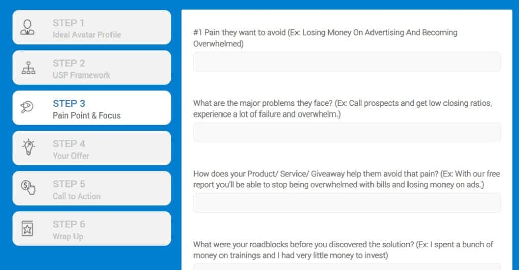 - Number 1 Pain they want to avoid (Ex: Losing Money On Advertising And Becoming Overwhelmed)