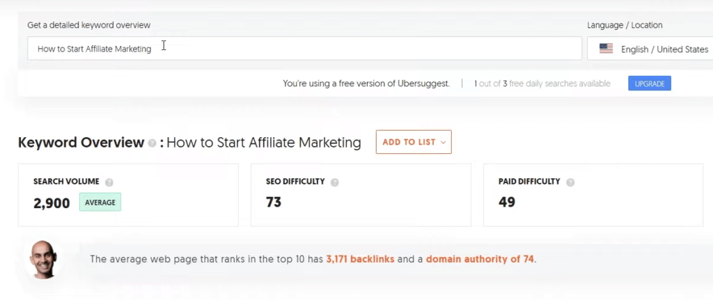 If you’re just using UberSuggest for keyword research make sure that you use it sparingly because you only get 3 searches a day and then you have to wait until the next day. So only use this for things that you really want to know the search volume of.