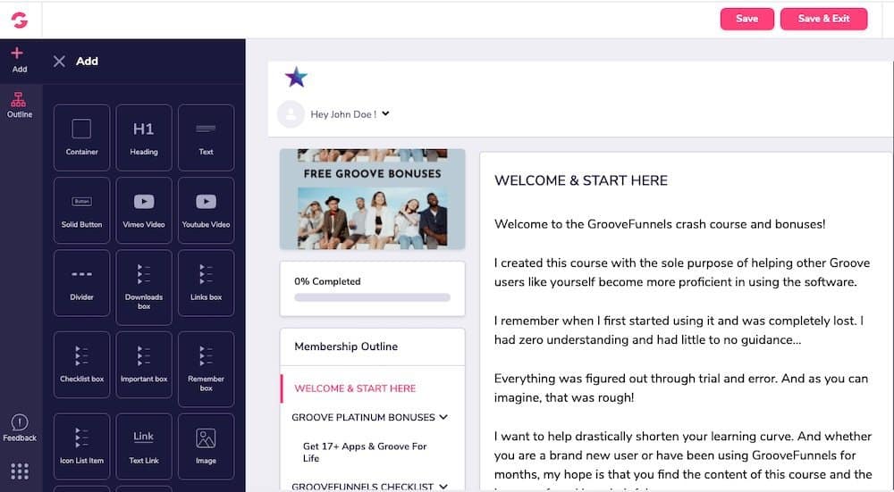 GrooveMember is their e-learning platform where you can create an online course and do other things like: