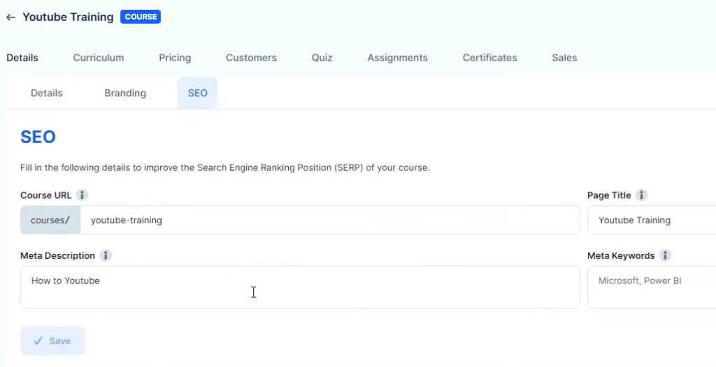 This is where you can decide if you want to show your courses in the search engines, change the URL, title tags, and things like that.