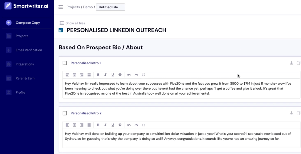 It uses unique data points that they collect across your prospect’s LinkedIn profile to create hyper-personalized messages that look super detailed as well as warm.