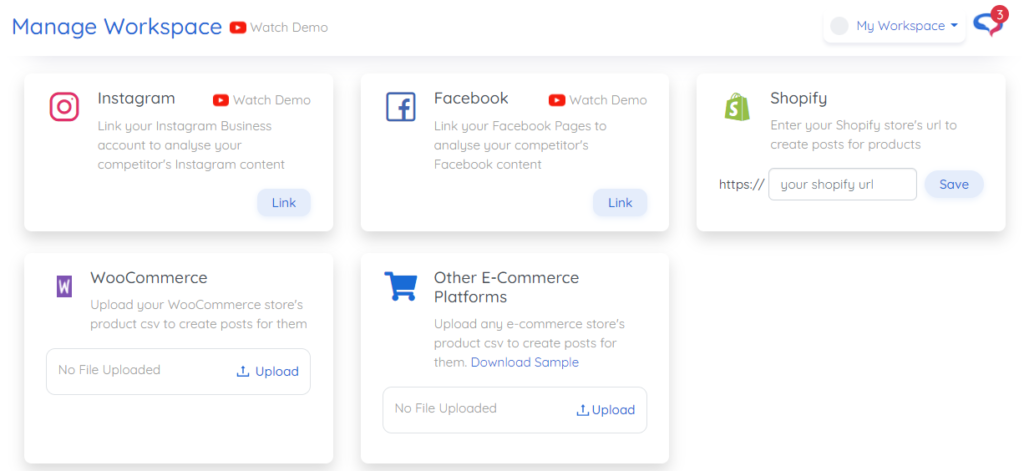 In the Predis.ai dashboard, the first thing you’re going to do is when you log in, go to the “manage workspace” then “integration” and add your social media accounts.