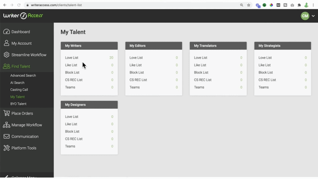 Alright, first things first, when you log in to the platform you’ll see your dashboard where you can find writers.