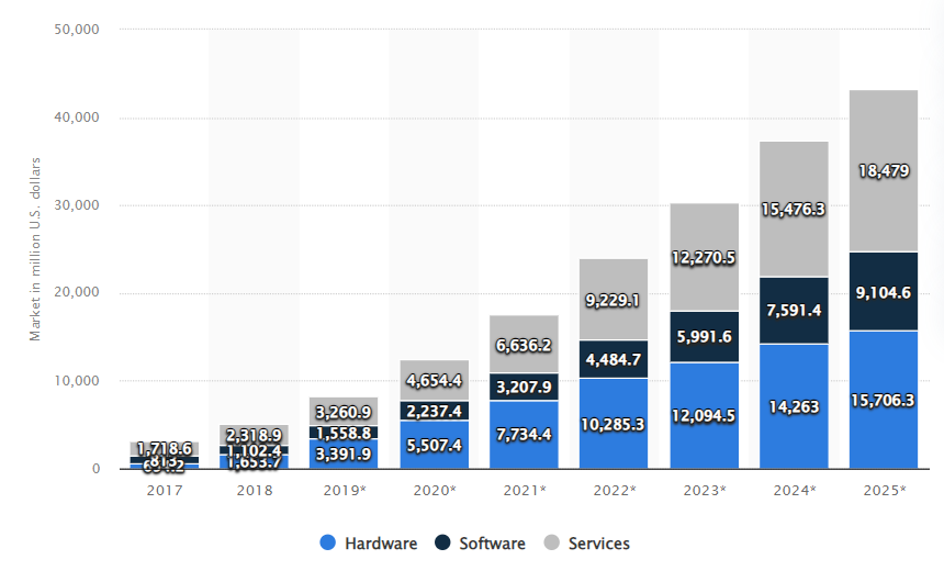 The NLP market is anticipated to grow from around three billion dollars in 2017 to about 43 billion in 2025, a nearly 14-times increase over its 2017 size (Statista)
