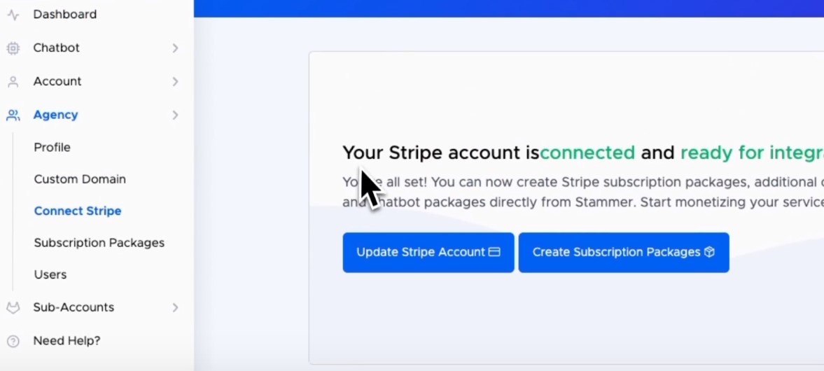 Step. 7. Connect your Stripe account to resell AI chatbots and message credits directly to your customers.