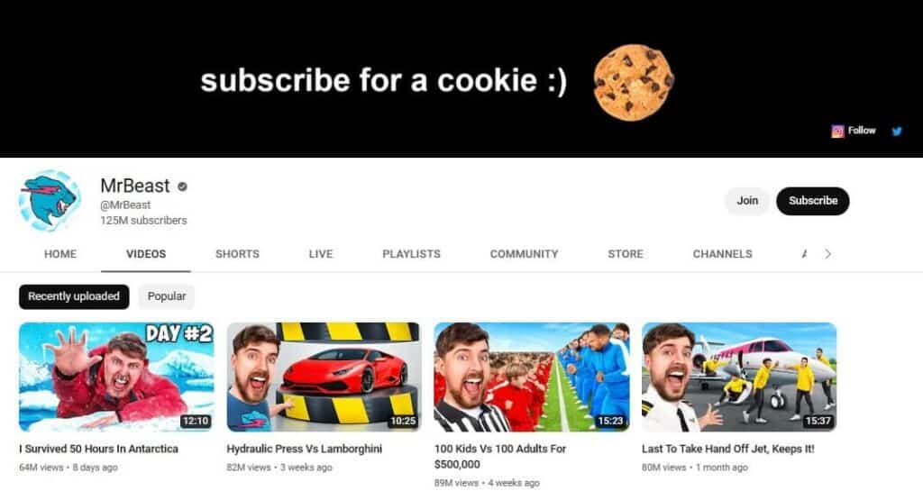 MrBeast is one of the most popular YouTubers with over 125 million subscribers. He is known for his extravagant videos, in which he performs elaborate stunts and challenges and often gives away large sums of money to his participants and viewers.
