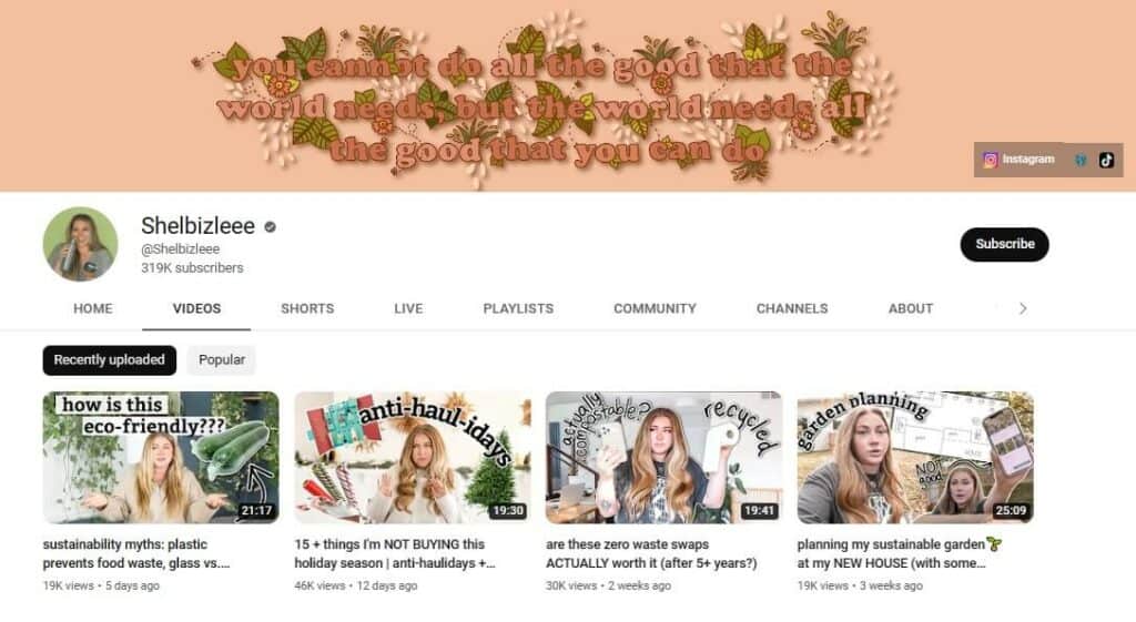 Shelbizleee is a popular YouTube channel that covers topics related to sustainable living and environmentalism, including green home improvements, eco-friendly products, and more.