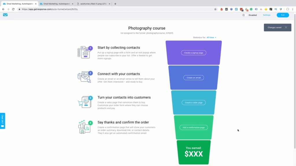 GetResponse Conversion Funnel gives you a very easy way of setting up sales funnels from start to finish in one place.